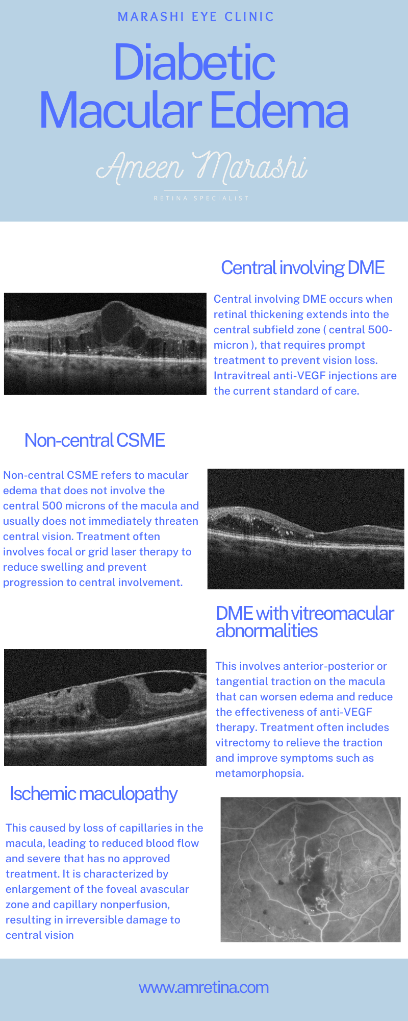 Visual differentiation between Central involving DME, Non-central CSME, and Ischemic Maculopathy.